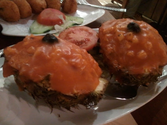 當待應上送上來的時間, 我們覺得很有趣, 原本我們打算是半個大菠蘿的焗飯, 這裹是2邊迷你型的菠蘿~ 剛剛好我們一人一邊~ 認真hapi~ 但飯裹很少菠蘿, 而且菠蘿不夠鮮甜,,,所以相信一定不是罐頭菠蘿 (不是好事/壞事)