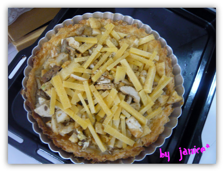 素魚旦和素扎肉炒熟後, 放入已舖上千層酥皮的分離模上, 加入芝士碎條