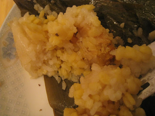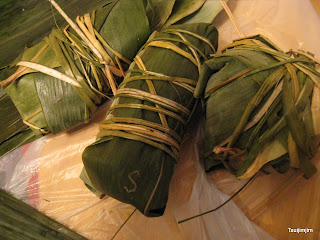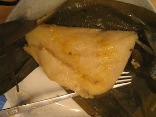 基本上, 入面真係好少餡, 我只係落左半個蛋黃,一粒瘦內, 同埋撕碎左ge 半粒乾榣柱, 所以總括黎講都算係幾清比起出面0個d, 加上出面0個d 糭一定冇自己整ge 咁乾淨, 始終我相信出面一定唔會每塊葉都有洗過lo~ 所以食得都安心d la :)
