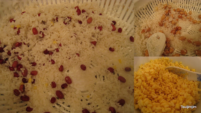 花生同紅豆都可以預先同糯米mix 埋, 但綠豆就反而要同糯米分開放入糭子裹, 原因問左ar 媽佢話不嬲都係咁, 冇原因=.= 我估可能係綠豆會溶, 會影響糭ge 密度掛~