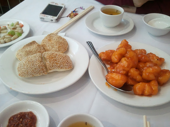 當然唔少得有甜品~ 見到有拔絲蘋!! 不過之前食過~所以係try new things~ lei個係入面好飲湯圓咁入面有d 紅豆~ 炸左佢~ 因為整個甜品係一d 都唔甜, 所以要靠另外碟上 ge砂糖, 所以都唔會好'留' , 因為這個甜品甜度可以自己控制~~
